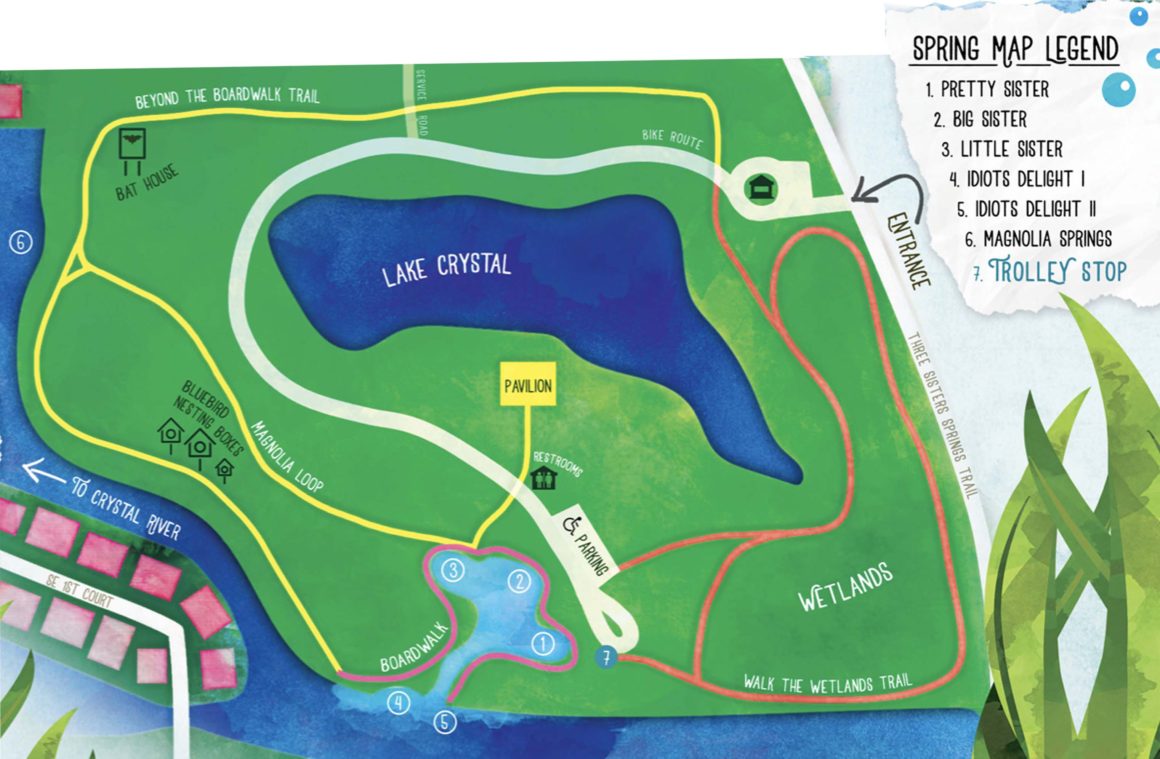 The spring consist of 3 pools (thats why the name three sisters) Pretty Sister, Big Sister and Little sister; plus other 3 other view points Idiots delight I and II and magnolia springs (see map below). The whole system has around 20 spring vents and in a single day up to 20 million gallons of water gushes from these springs into kings bay (amazing huh).